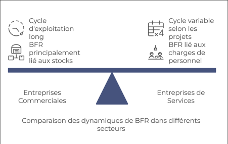 À noter : Une entreprise de services n’ayant pas de stock doit avancer ses charges courantes avant facturation, appelées "travaux en cours". Son BFR se calcule en fonction du coût journalier, des charges (dont la rémunération) et du nombre de jours nécessaires à la mission.