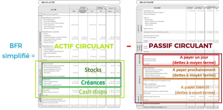 BFR = (Stocks + Créances clients + Charges constatées d'avance) - (Dettes fournisseurs + Dettes fiscales et sociales)
