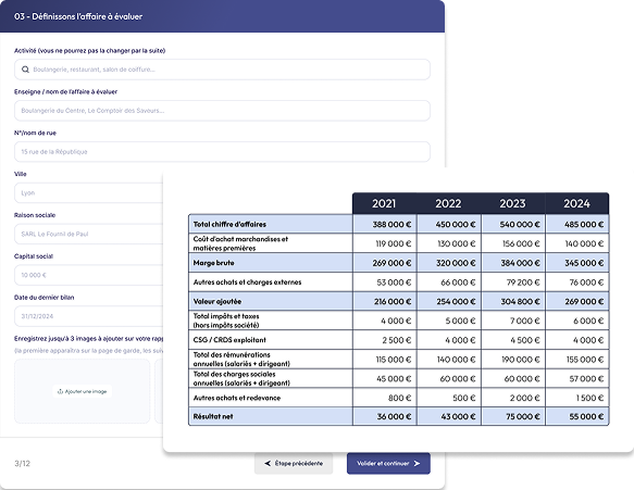 Fort de 15 ans d’expertise en cession, nous rendons un savoir-faire pointu accessible à tous via une interface intuitive. Notre algorithme analyse en profondeur chaque facteur et génère instantanément un rapport clair, détaillé et exploitable, présentant :